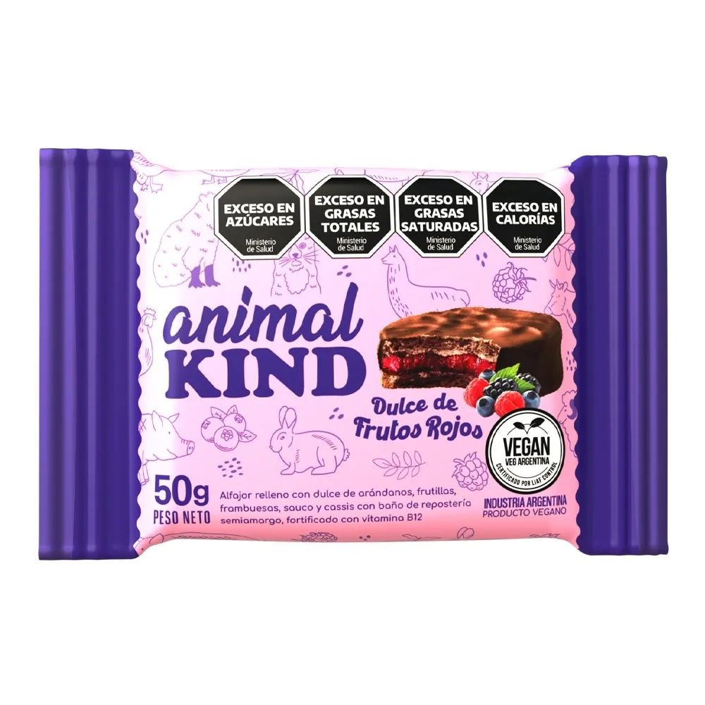 El Alfajor ANIMAL KIND de frutos rojos bañado 50g combina un relleno suave con el sabor fresco y ligeramente ácido de los frutos rojos, complementado por un baño que realza su dulzura y textura.