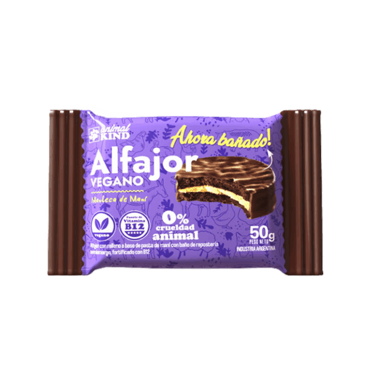 El Alfajor Vegano ANIMAL KIND con manteca de maní bañado 50g es una opción irresistible para quienes buscan sabor y calidad sin ingredientes de origen animal.
