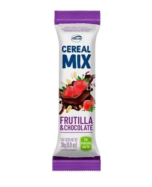 Arcor Cereal Mix Frutilla y Chocolate 26 g es una barrita de cereal pensada para meriendas o snacks. Combina la textura crujiente del cereal con el sabor frutal de la frutilla y un toque dulce‑chocolatoso, resultando en una opción deliciosa y práctica.