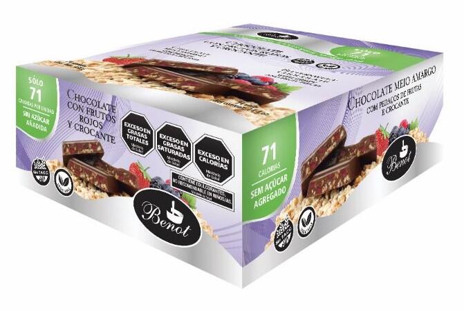 Chocolate BENOT elaborado con cacao de calidad, combinado con frutos rojos que aportan un contraste levemente ácido y refrescante, y un agregado crocante que suma textura y carácter en cada bocado.