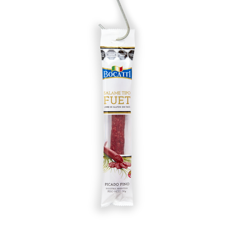Salame tipo fuet elaborado con picado fino y libre de gluten. Presenta una textura firme y un sabor suave característico, ideal para picadas, sándwiches o para disfrutar en tablas de fiambres.