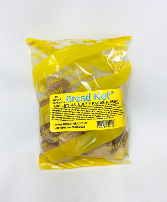 BREAD NET galletitas nuez y pasas rubias 200g combinan el sabor suave y característico de las nueces con la dulzura natural de las pasas rubias.