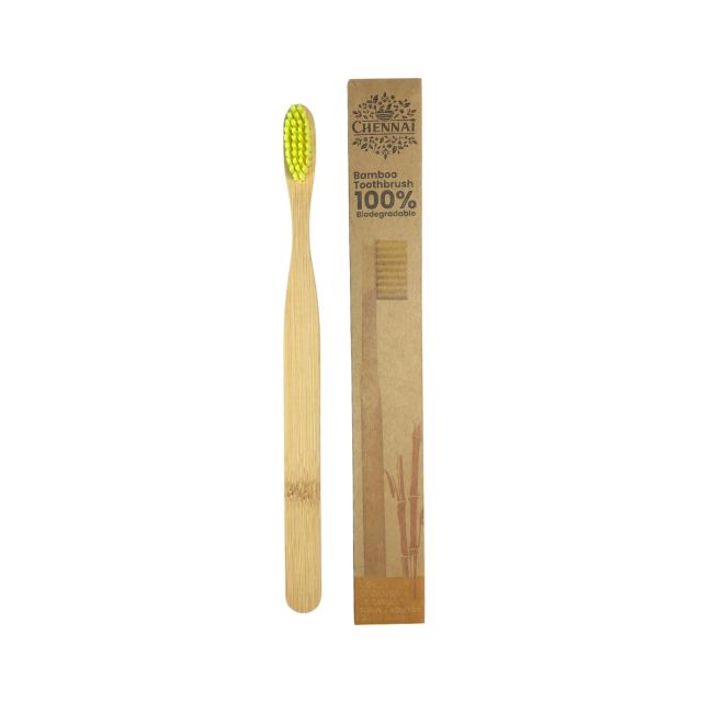 Cepillo de dientes ecológico con mango de bambú y cerdas de dureza media, ideal para una higiene bucal sustentable.