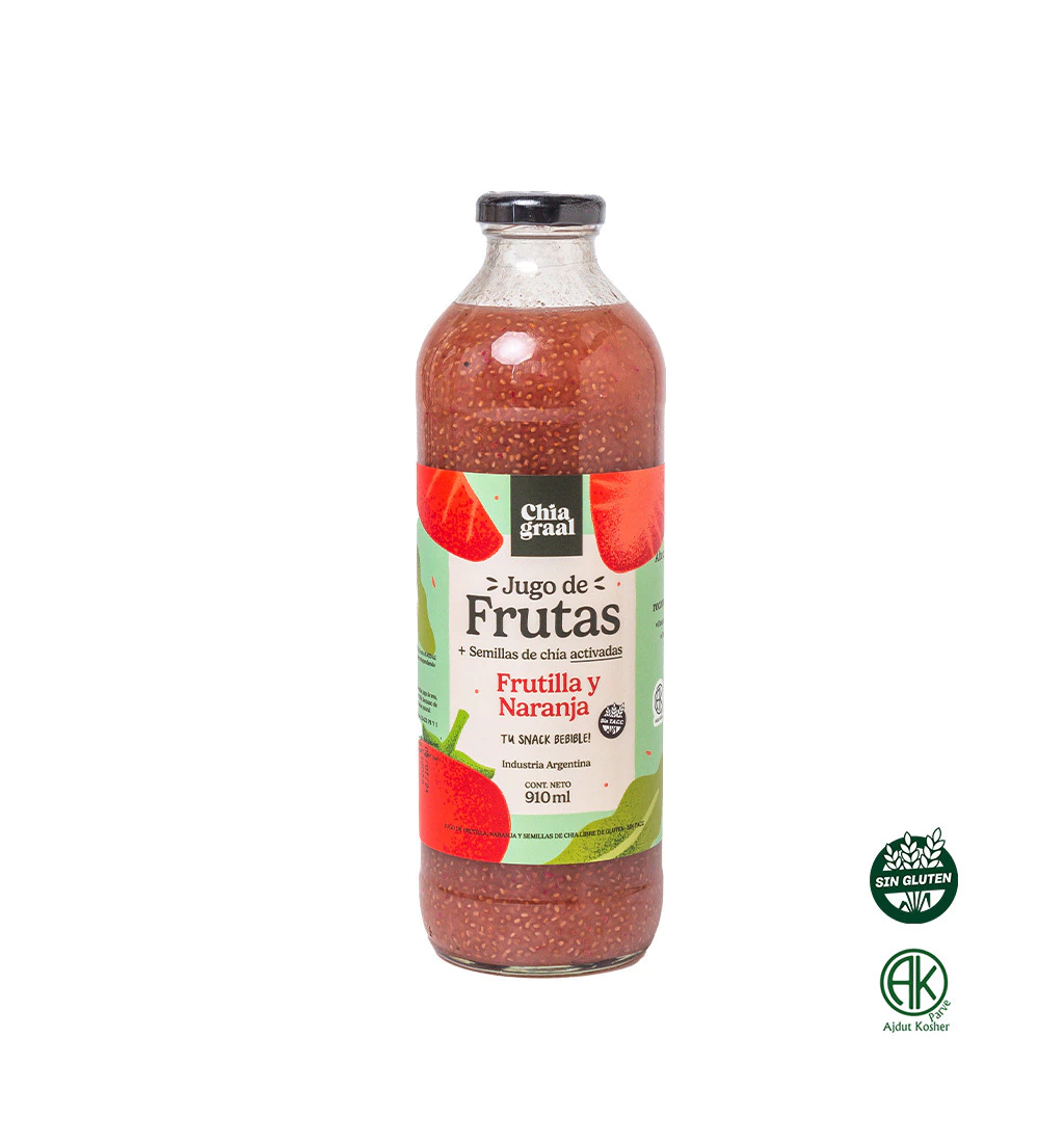 Bebida refrescante con semillas de chía y mezcla frutal de frutilla y naranja.