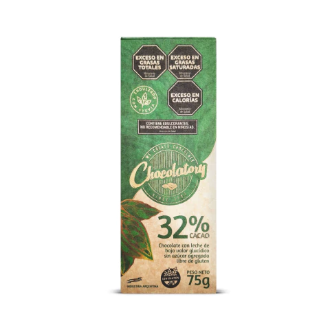 Chocolate con leche con 32% de cacao y sin azúcar agregado, ideal para quienes buscan una opción dulce con menor contenido de azúcar.
