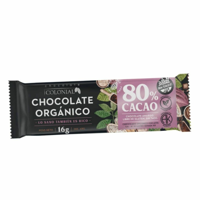 Barra de Chocolate Organico Negro 80% Cacao x 16g – Chocolate Colonial – Pequena barra de chocolate negro organico con 80% de cacao, perfecta para llevar y disfrutar en cualquier momento.