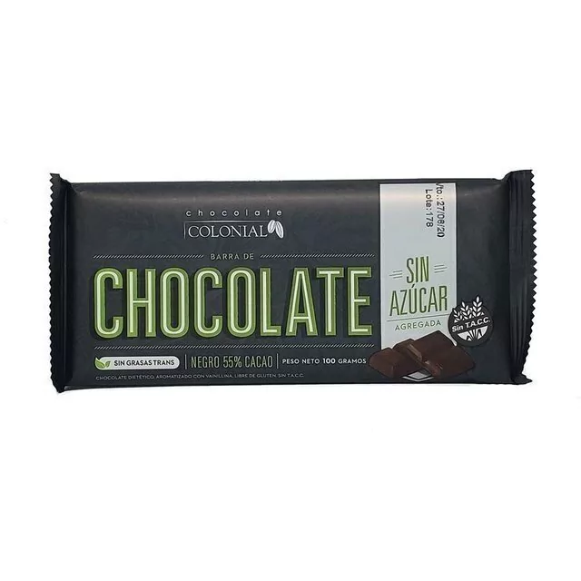 Chocolate con 55% de cacao elaborado sin azúcar agregado.