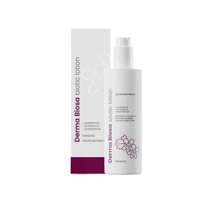 Loción natural con biotecnología probiótica que hidrata y protege la piel, con suave fragancia de geranio.