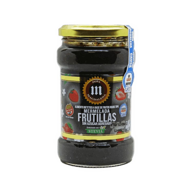 Mermelada dulce y liviana, sin azúcar, con sabor a frutilla.