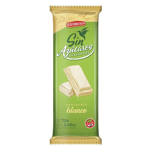 Georgalos Chocolate Blanco Sin Azúcar 70g ofrece una textura suave y cremosa con el sabor característico del chocolate blanco, pero en una versión sin azúcares agregados.