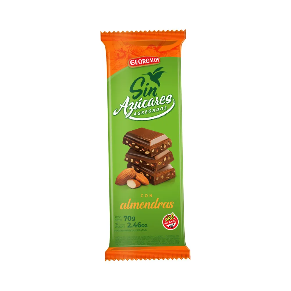 Georgalos Chocolate Sin Azúcar con Almendra 70g combina la suavidad del chocolate sin azúcares agregados con el toque crocante y natural de las almendras.