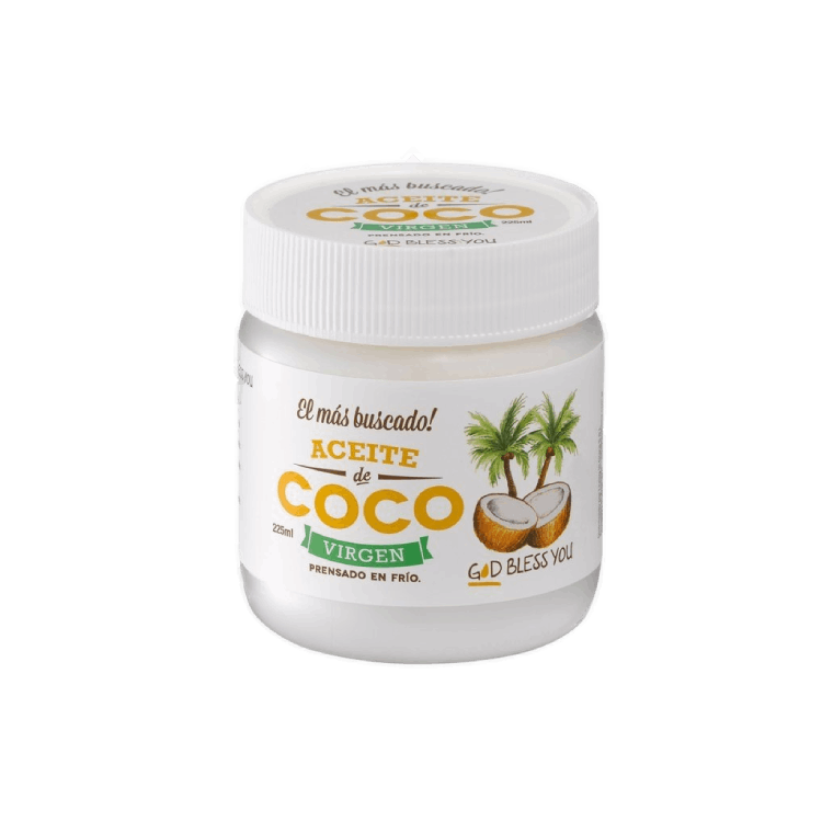 El GOD BLESS YOU Aceite de coco virgen 225ml ofrece la pureza del aceite extraído de pulpa fresca, conservando su aroma suave y todas sus propiedades nutritivas.