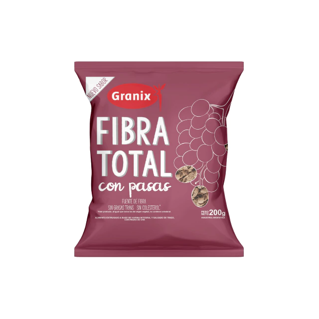 La Fibra Total con Pasas de GRANIX combina cereales integrales seleccionados con pasas jugosas, ofreciendo un desayuno o snack nutritivo y lleno de energía.
