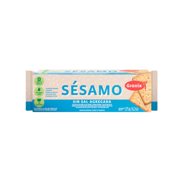 Las galletitas de sésamo sin sal de GRANIX combinan la textura crocante de la masa con el sabor natural de las semillas de sésamo, sin agregado de sal.