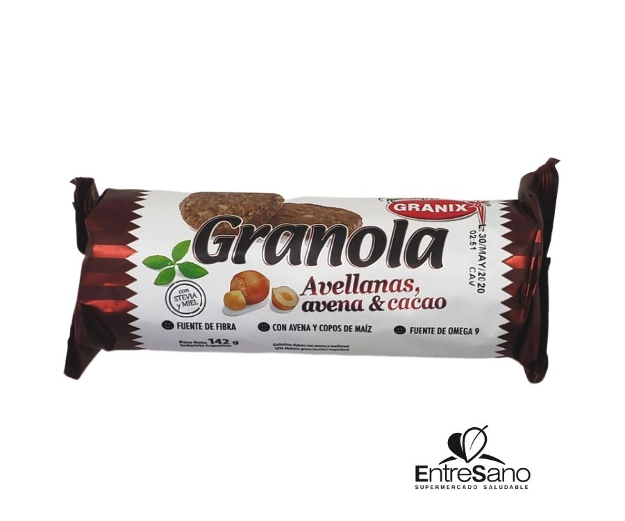 La granola de avellanas, avena y cacao de GRANIX combina la suavidad de la avena integral con el sabor intenso del cacao y la crocancia de las avellanas tostadas.