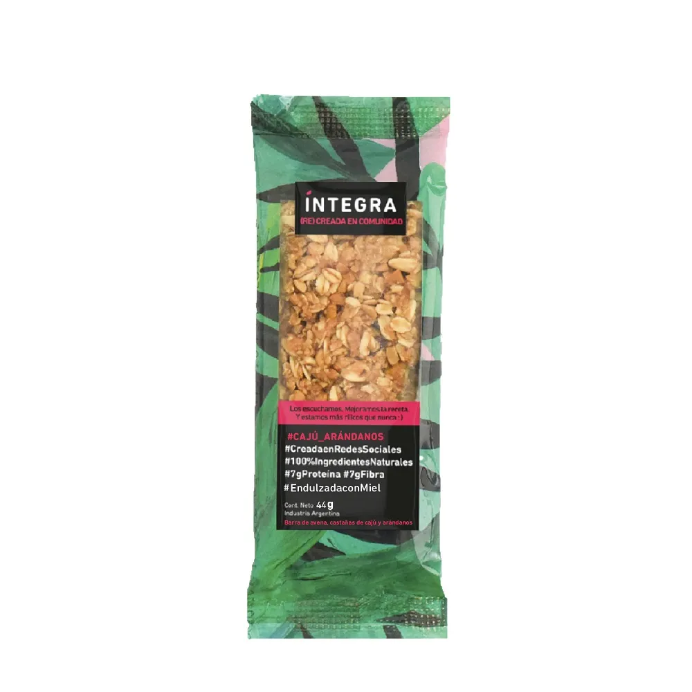 La INTEGRA barra de cajú y arándano de 44 g combina la cremosidad y el sabor delicado del cajú con la frescura y leve acidez de los arándanos, logrando un equilibrio perfecto entre dulzura y textura.