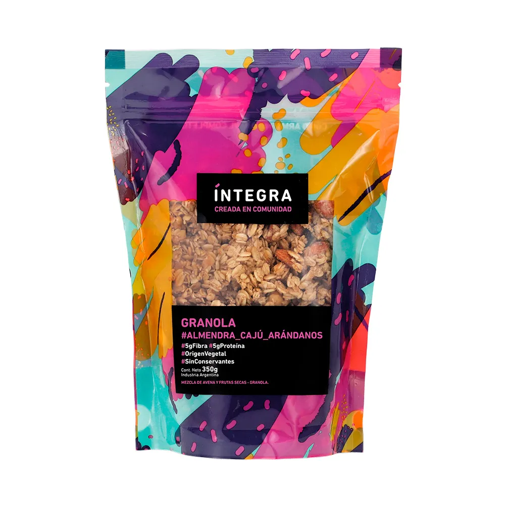 La INTEGRA granola de almendra, cajú y arándanos 350g combina cereales crocantes con frutos secos seleccionados y arándanos que aportan un toque naturalmente dulce y frutado. Las almendras y el cajú suman textura y sabor, logrando una granola armónica y versátil.