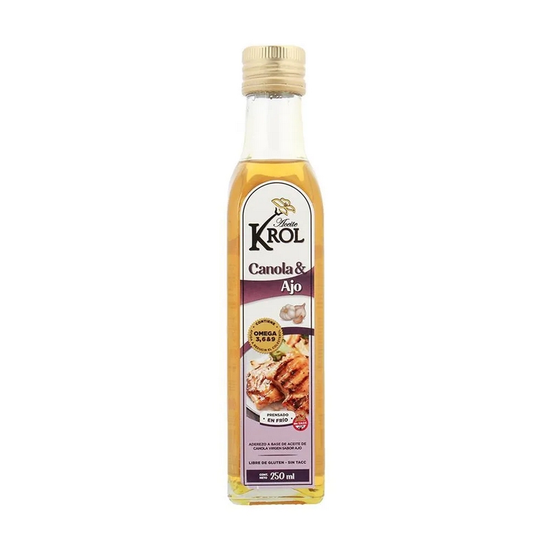 KROL Aceite de Canola y Ajo 250ML combina la suavidad del aceite de canola con el aroma y sabor característico del ajo. Perfecto para saltear, cocinar o aliñar ensaladas, aportando un toque delicioso y natural a tus recetas diarias.