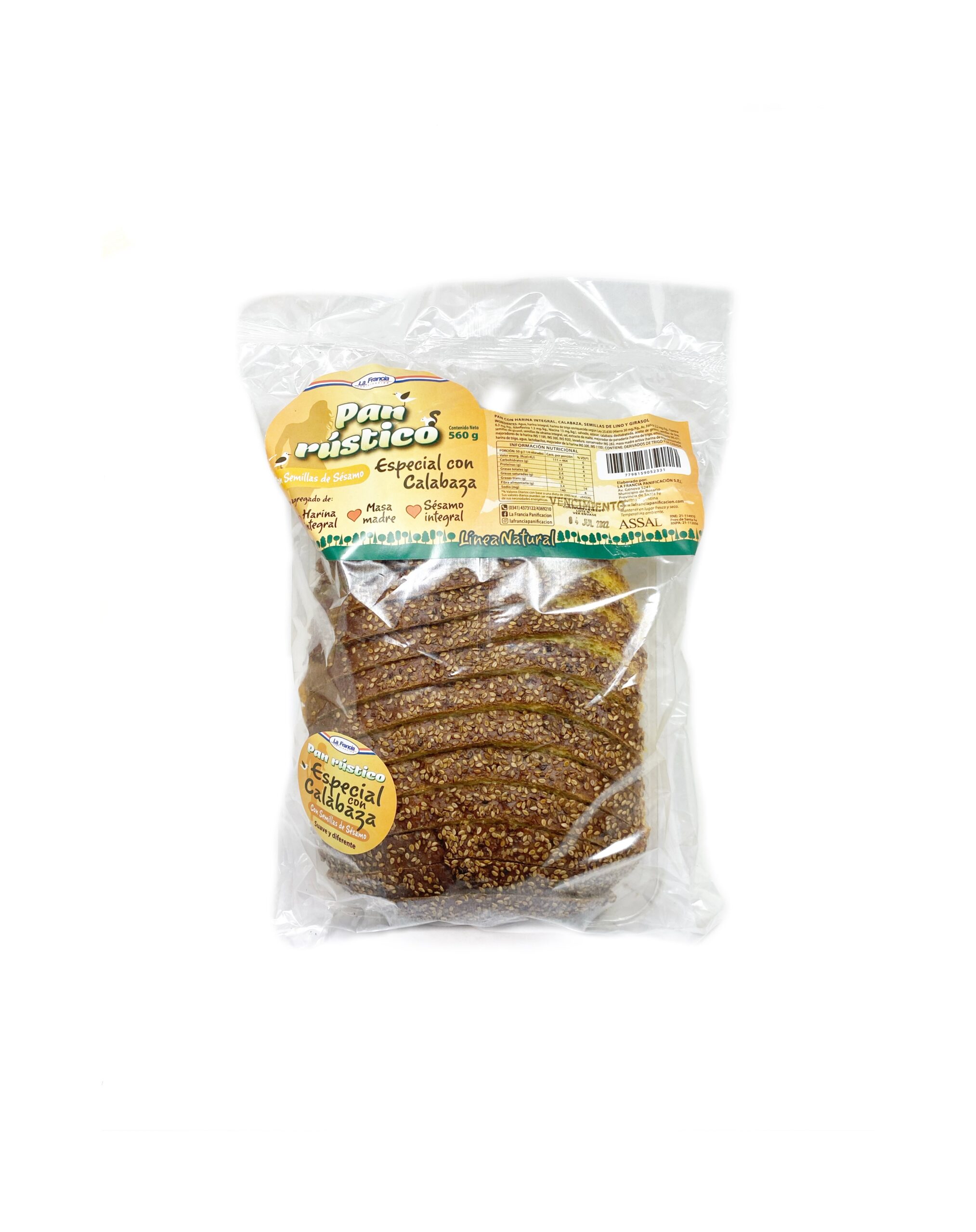 Pan elaborado con harina de calidad, calabaza y semillas de sésamo, ofreciendo una textura suave y crujiente a la vez. Rico en fibra y nutrientes, ideal para acompañar comidas o preparar sándwiches saludables.