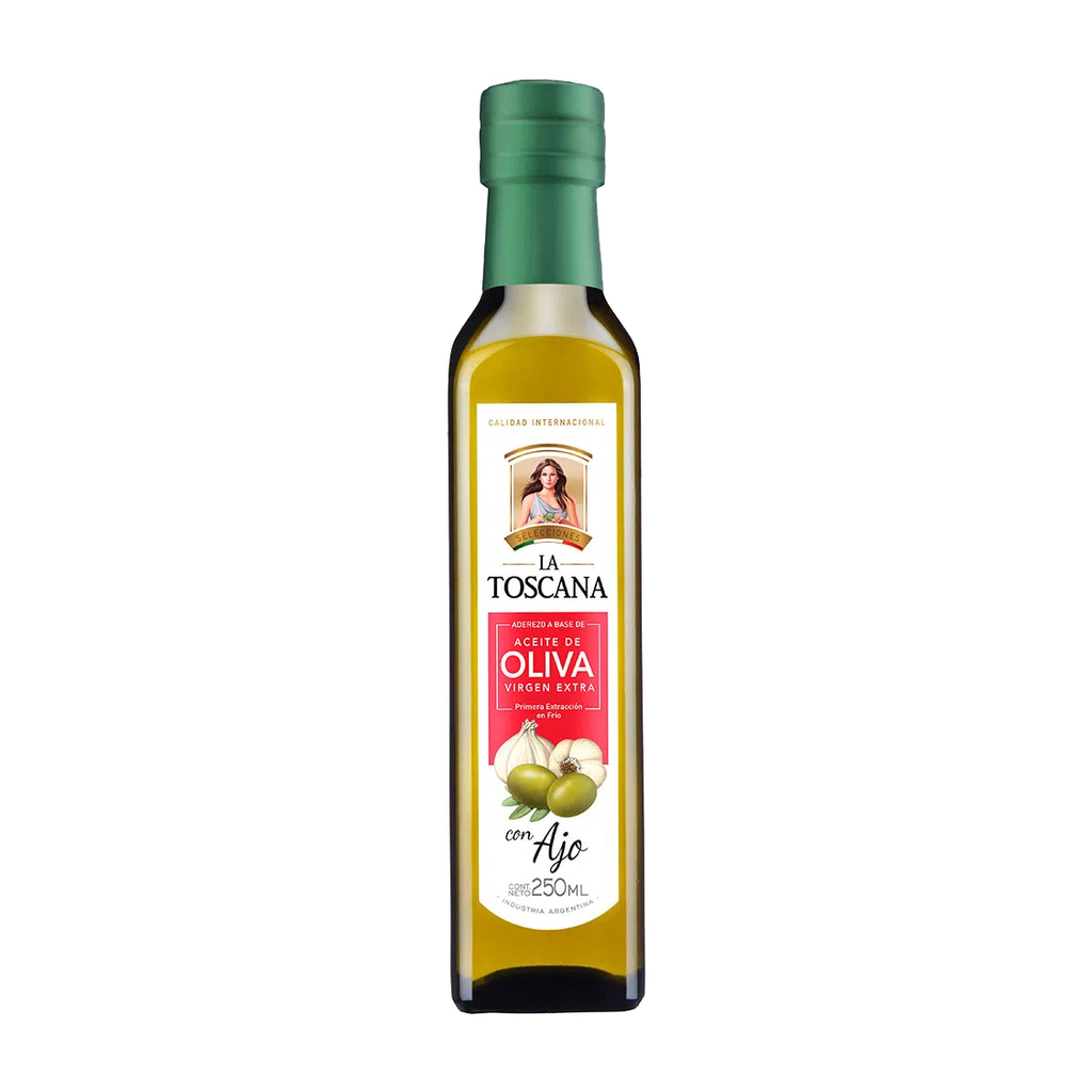 Disfrutá de LA TOSCANA Aceite de Oliva con Ajo, un aceite extra virgen de alta calidad infusionado con ajo fresco. Perfecto para aderezar pastas, ensaladas, pizzas o carnes, su sabor intenso y aromático aporta un toque distintivo a cada receta, convirtiendo cualquier plato en una experiencia culinaria única.