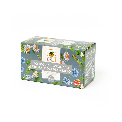 Oasis n°13 presión alta combina achicoria, pasionaria, ortiga y cola de caballo, hierbas tradicionalmente utilizadas para acompañar rutinas de bienestar vinculadas al equilibrio del organismo.