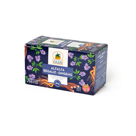 La Mezcla N°6 de Hierbas del Oasis combina alfalfa, regaliz y ginseng — ingredientes seleccionados para ofrecer un impulso natural de energía sin necesidad de estimulantes fuertes.