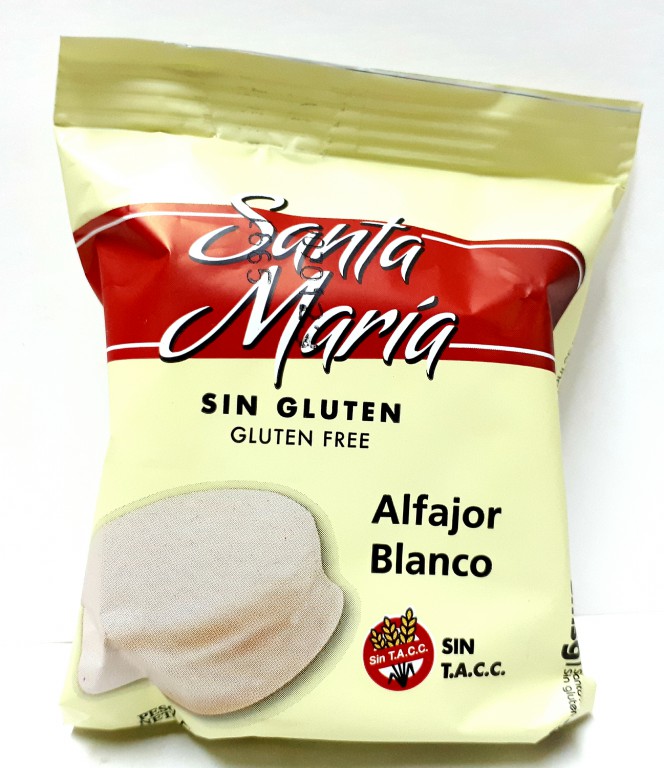 SANTA MARIA Alfajor Blanco: delicioso alfajor relleno de dulce de leche y bañado en cobertura blanca, ideal como snack o postre rápido.