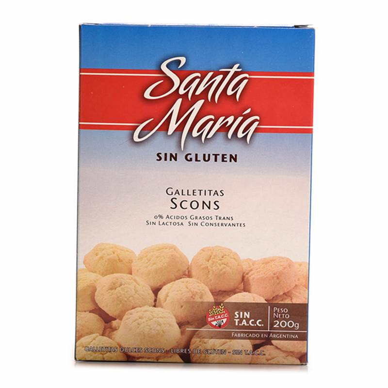 Las Galletitas Scones Sin TACC de SANTA MARIA 200 g son suaves por dentro y ligeramente crujientes por fuera, ofreciendo un bocado delicioso y equilibrado. Son aptas para celíacos (sin TACC), perfectas para disfrutar en cualquier momento del día, como snack, acompañamiento de café o para preparar postres caseros.