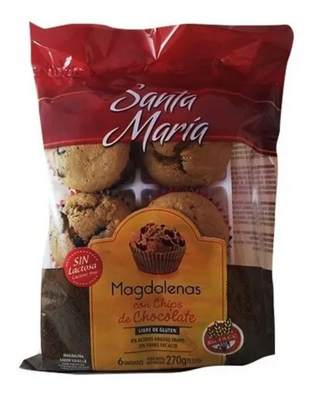 Las Magdalenas con Chips Sin TACC de SANTA MARIA 270 g son suaves, esponjosas y están llenas de trozos de chocolate, ofreciendo un bocado delicioso y práctico. Son aptas para celíacos (sin TACC), por lo que pueden disfrutarlas quienes siguen una dieta libre de gluten.