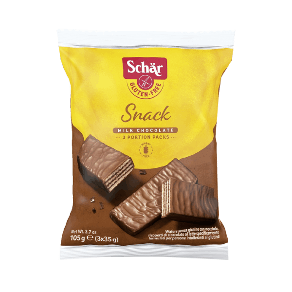 Los SCHAR Snack Choco 105 g son deliciosos barquillos sin gluten, rellenos de una suave crema de avellanas y bañados en un 40% de chocolate con leche. Su combinación de sabores y texturas los convierte en el snack perfecto para disfrutar en cualquier momento del día.
