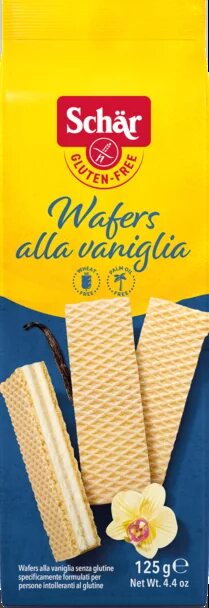 Los SCHAR Wafers Vainilla 125 g son finos barquillos sin gluten, elaborados con capas crujientes y un suave relleno de crema de vainilla. Su textura ligera y sabor delicado los convierten en el acompañamiento perfecto para tu café, té o como un dulce tentempié en cualquier momento del día.