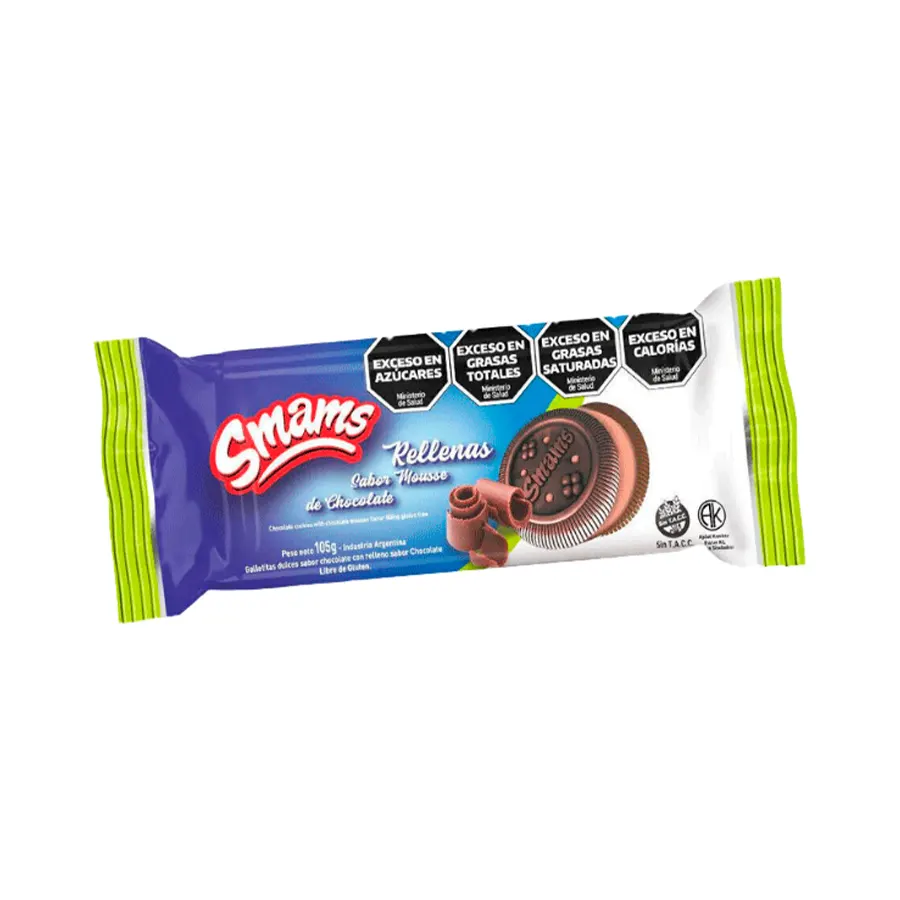 SMAMS Galletitas Rellenas Mousse Chocolate 105g son galletitas con relleno de mousse de chocolate, presentadas en envase de 105 gramos.