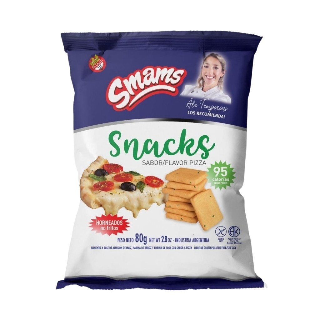 Los SMAMS Snacks Sabor Pizza 80 g son el snack perfecto para quienes buscan una opción salada, crujiente y libre de gluten (sin T.A.C.C.). Estos snacks están elaborados con ingredientes seleccionados y cuentan con un delicioso sabor a pizza, ofreciendo una combinación de textura crujiente y sabor auténtico en cada bocado.