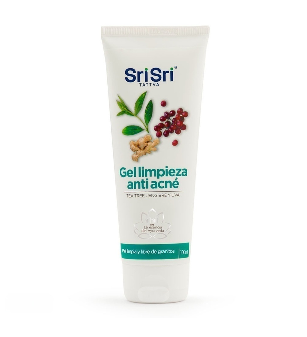 El Gel de Limpieza Facial Ayurvédico Sri Sri Tattva Anti Acné es 100% Natural. Mantenga tu rostro limpio, radiante y libre de granitos. Ingredientes Activos: Jengibre,Tea Tree Oil, Uva. No testado en animales. Apto para Veganos. Libre de Parabenos. Elaborados en India. Desarrollado por meditadores Apto Celíacos. Libre de Gluten.