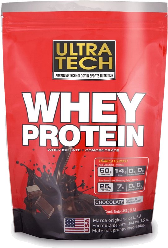 Proteína en polvo Ultra Tech con fórmula de suero concentrado y aislado, diseñada para favorecer la recuperación muscular y el desarrollo físico. Delicioso sabor a chocolate, de fácil disolución y perfecta para batidos post-entrenamiento.