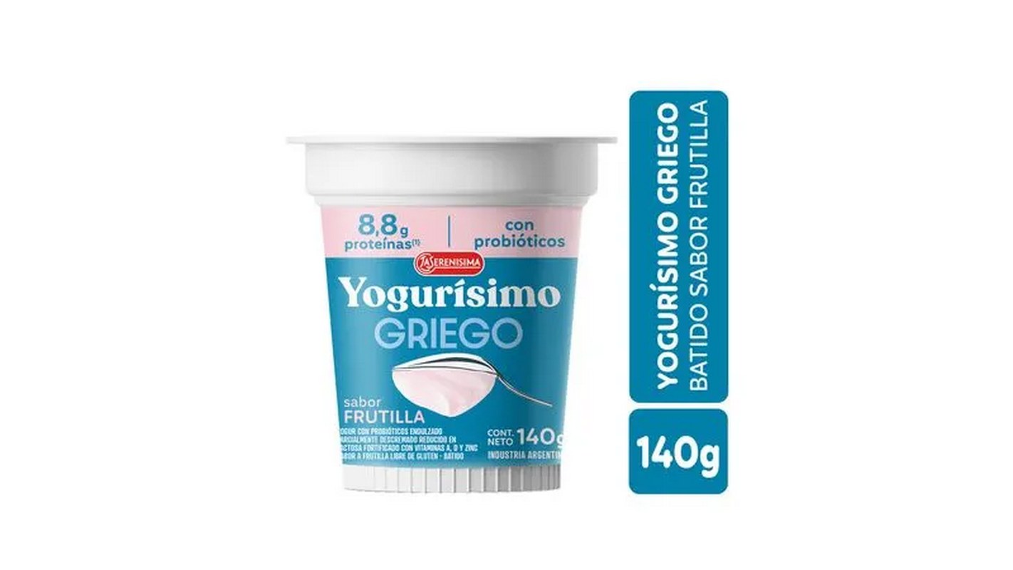 Disfrutá la suavidad y cremosidad del Yogur Griego Yogurísimo sabor frutilla 140g, elaborado con leche de alta calidad y fermentos naturales que garantizan un yogur espeso, nutritivo y delicioso.